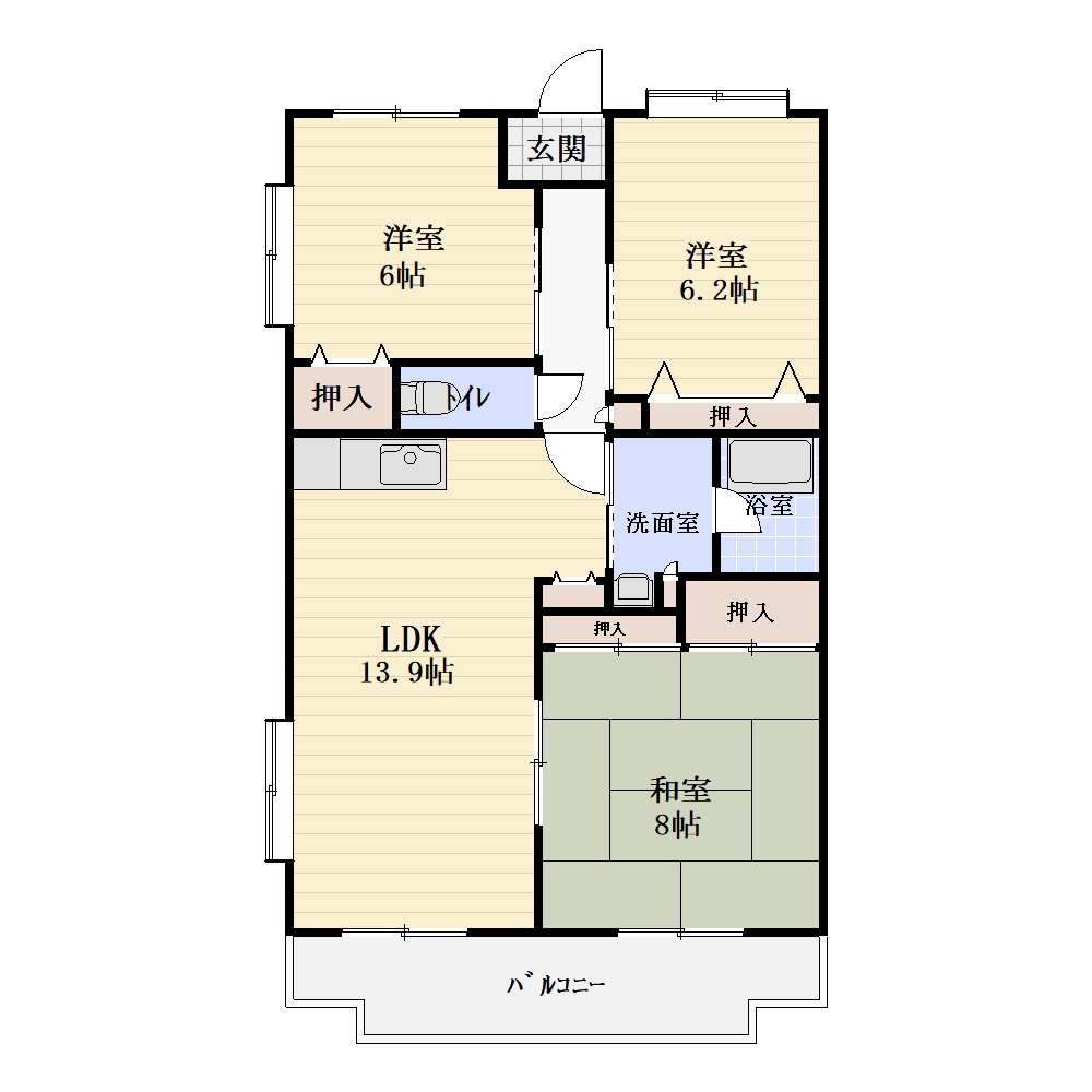 | 間取り内訳 | LDK13.9帖・洋室6帖・洋室6.2帖・和室8帖 |